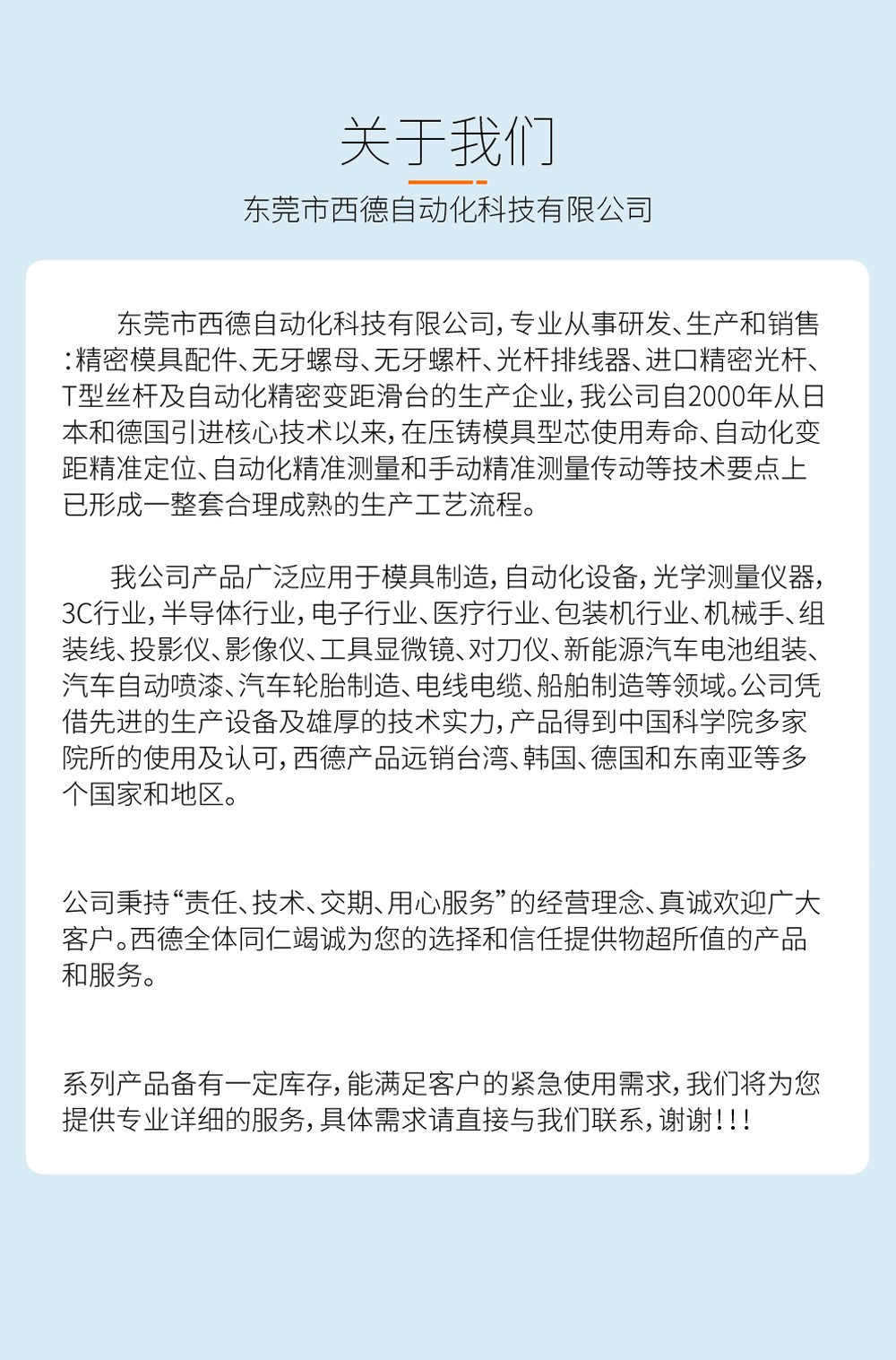 東莞市欣達工業自動化有限公司從事研發、生產和銷售變距滑臺變距模組刀片氣缸、一體式微型滑臺真空氣缸、旋轉真空氣缸、無牙螺母、無牙螺桿、光桿排線器、進口精密光桿、T型絲桿及精密模具配件的生產企業, 歡迎廣大新老客戶來電咨詢,聯系電話:13686286625。